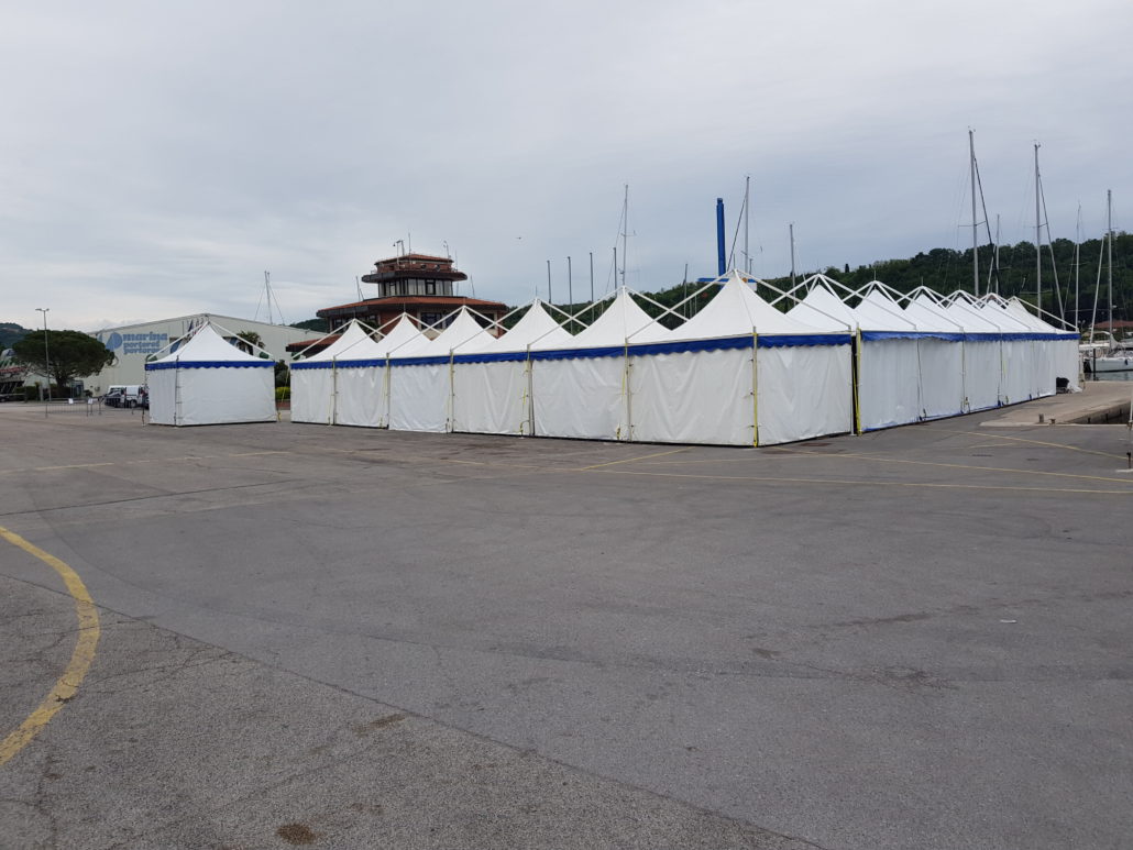 Pagode/gazebo dimenzija 5x5m od brendiranog proizvođača Giulio Barbieri. Pagode/gazebo su pogodne za sve vrste sajmova, vjenčanja i manifestacija. Konstrukcija je aluminijska sa bijelim ili prozirnim Serge Ferrari PVC ceradama od vodonepropusnog i negorućeg materijala.
